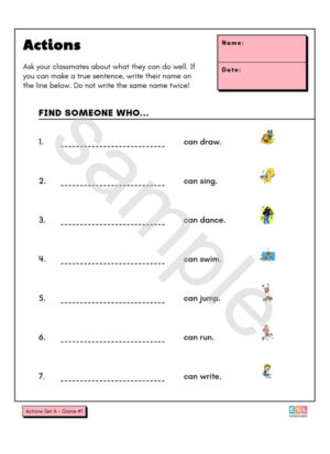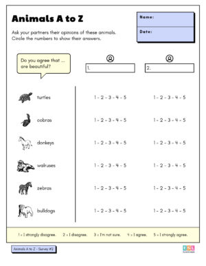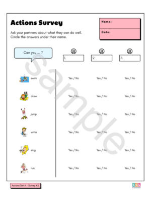 To complete the survey worksheet, students must use the question stem and vocabulary prompts on the page to ask their partner questions, and then circle one of the options provided to record their partner’s answers. There is space to interview two or sometimes three different people. Most of the survey responses are “Yes / No” . Depending on the age and language level, students can optionally ask follow-up questions and jot brief notes next to the response options.