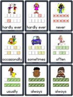 These flashcards show pictures of common actions or daily activities together with prompts for making sentences with adverbs of frequency.