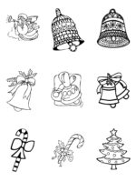 27 images, 9 images per page. Pictures include an angel, bells, candy canes, Christmas trees, gifts, gingerbread, Christmas lights, an ornament, a snowman, stockings, toys, a teddy bear, a train, wreaths.