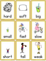 Each card depicts only one vocabulary word, but the words in this set are paired. For example, there is a card for ‘small’ and one for ‘big’, happy and sad, strong and weak, etc.