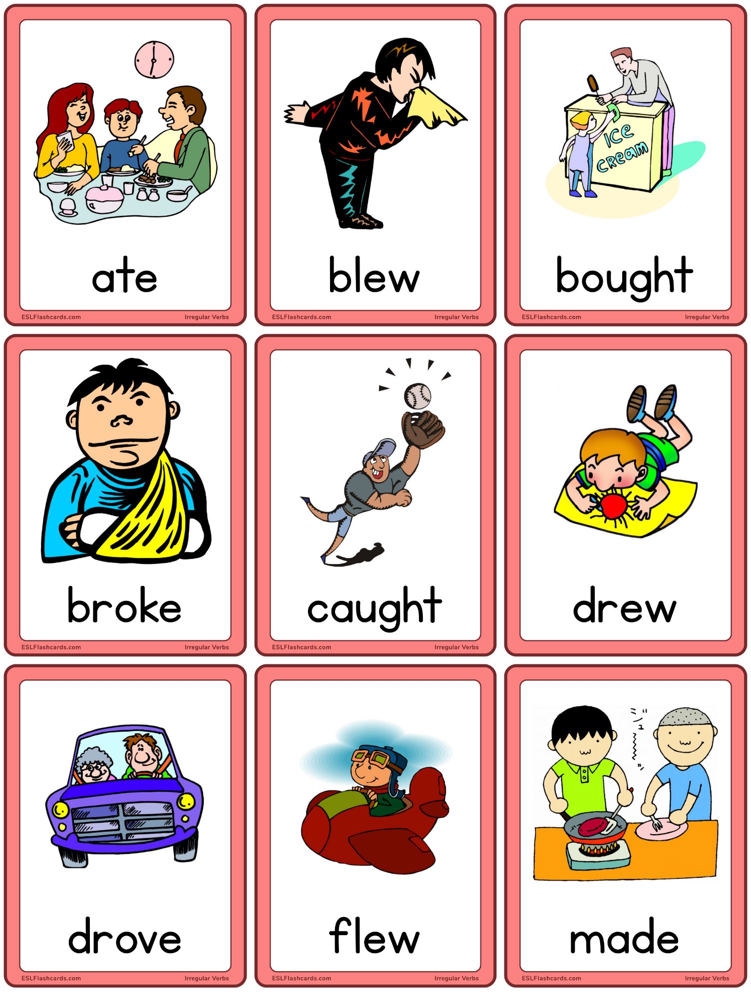 18 picture cards for teaching irregular past tense verbs. Includes past tense verb cards with the base verb.