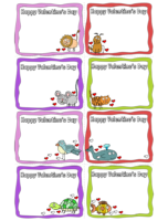 This set features adorable little creatures surrounded by hearts. Each card says "Happy Valentine's Day" in an outline font. Kids can colour the letters and write a short message.