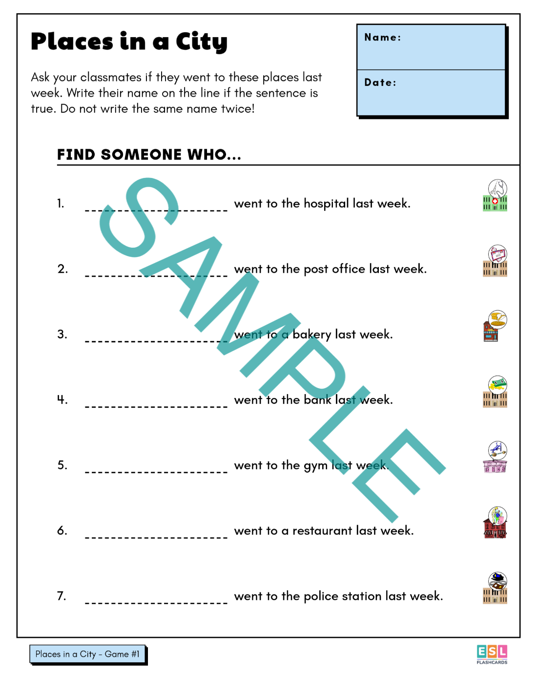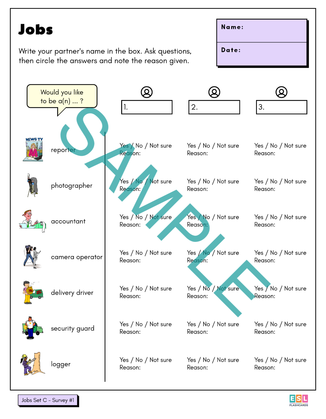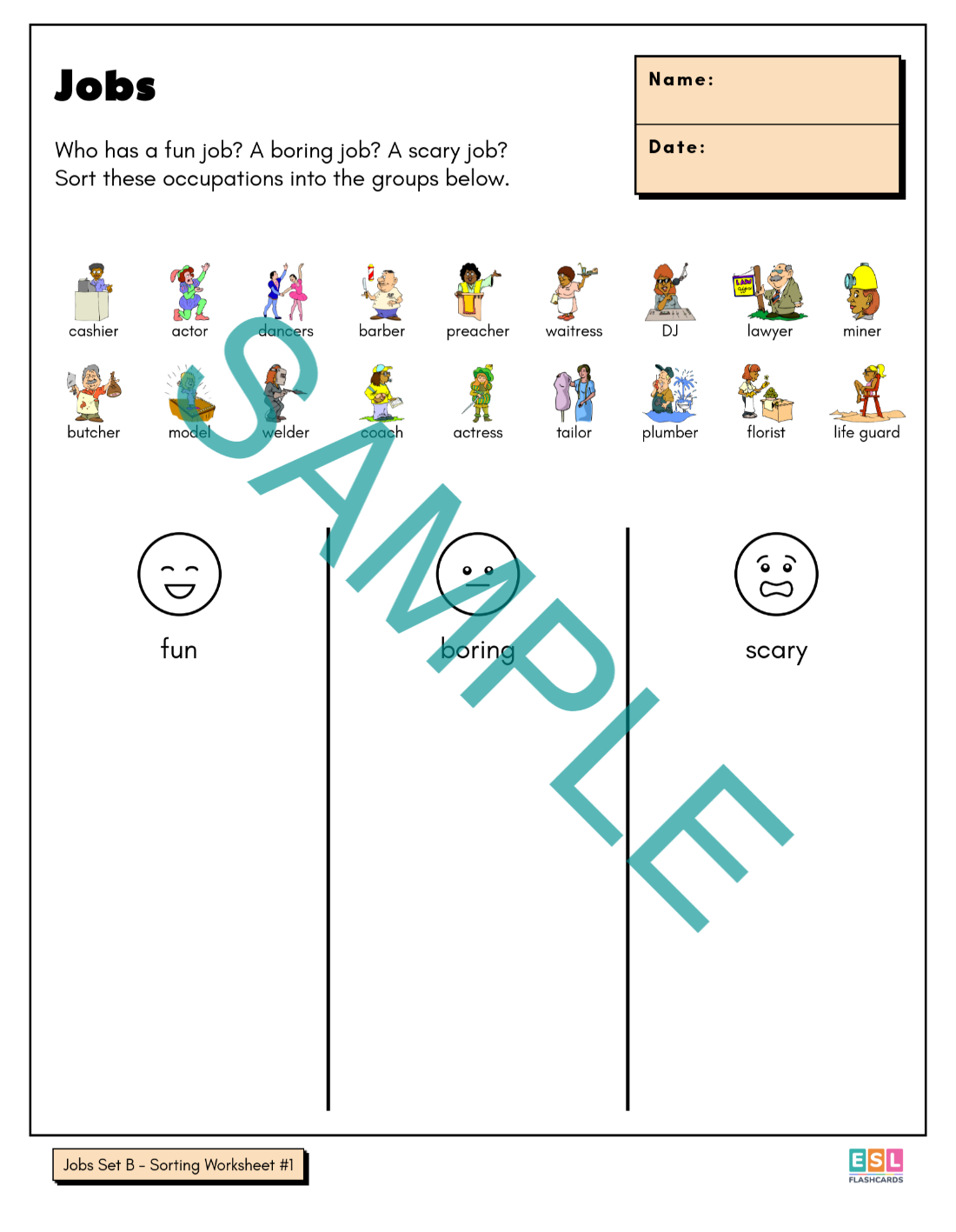 Most worksheet topics are beginner-friendly, with the exception of Jobs Set C which has words like “accountant” and “weathercaster” and is more appropriate for intermediate level or above. Like the flashcard sets, the Places in a City and all of the Jobs Worksheets have variations with British English and Canadian vocabulary differences. These are duplicates of the worksheets with American English, just with different spellings and/or word choices.