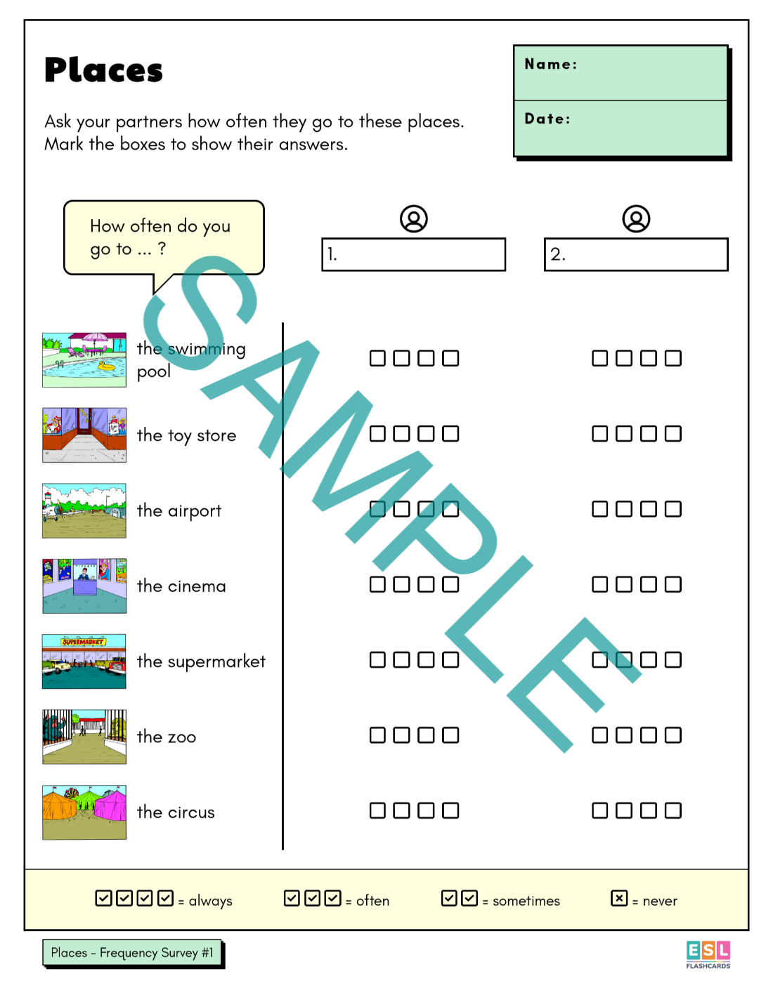 110 worksheets with activities for talking about family, jobs, places in the city and places in nature. Includes solo, pair and small group exercises.